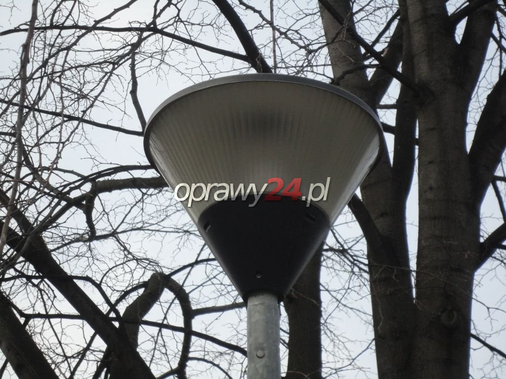 Budowa. Oprawa jest wykonana z odlewanego ciśnieniowo aluminium, zaś górna pokrywa z płyty aluminiowej. Oprawa jest powlekana wieloetapowo. W pierwszym etapie czarną powłoką proszkową, która jest odporna na korozję i na działanie mgły solnej. Stabilizowanie promieniami UV to etap drugi. Na koniec wykończenie szorstką powłoką akrylową grafitową lub szarą. Klosz jest wykonany z poliwęglanu samogasnącego i stabilizowany promieniami UV. Klosz jest wykończony wewnątrz fasetowaniem. Matowa powierzchnia zapobiega olśnieniu i zapewnia równomierne rozproszenie strumienia świetlnego. Raster zapobiega zanieczyszczeniu oświetleniem. Stopień szczelności: IP65. Oprawa jest przeznaczona do zamontowania szczytowego na słupie o średnicy 60mm.